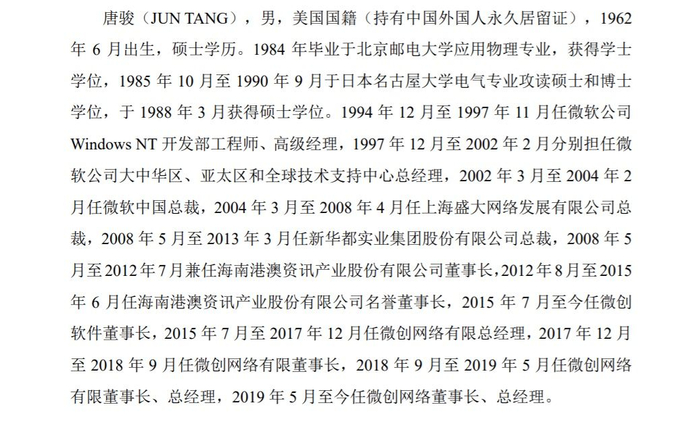 招股书显示唐骏硕士学历、美国国籍