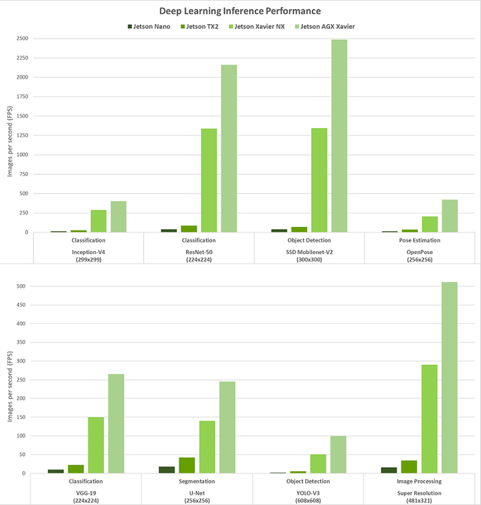另外,英伟达还为Jetson系列产品做了硬件性能评估的基准测试,基于MLPerf Inference 0.5基准测试,对比了几款产品在图像分类,物体检测,姿态估计,分割等处理人物上的实时性能。