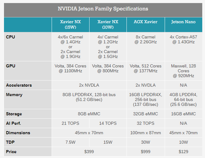 目前,英伟达的Jetson平台已经发布了小型AI计算机Jetson Nano、用于完全自主机器的Jetson AGX Xavier系列和用于边缘人工智能的Jetson TX2系列,再加上刚刚发布的Jetson Xavier NX,四款产品适用于不同性能、预算需求的应用场景。