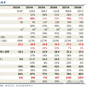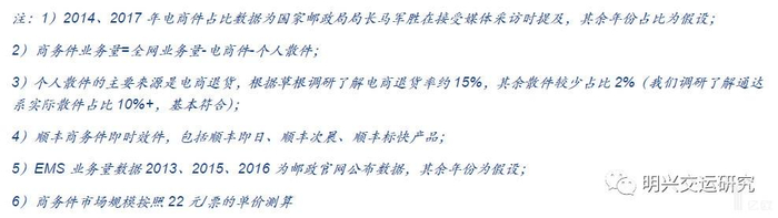 我们测算2018年商务件业务量规模约48亿件,市场占比逐年下滑,业务量市场占比约9%;市场收入规模约1054亿元,近年增速趋缓。