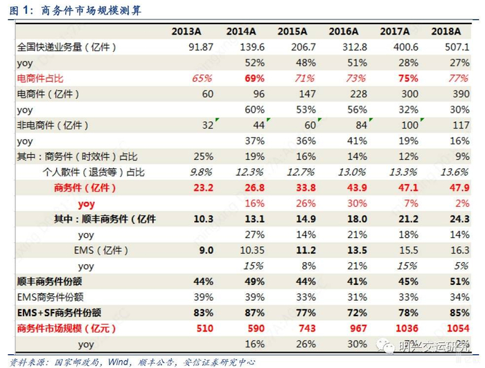1、商务件市场千亿规模,顺丰占主导地位