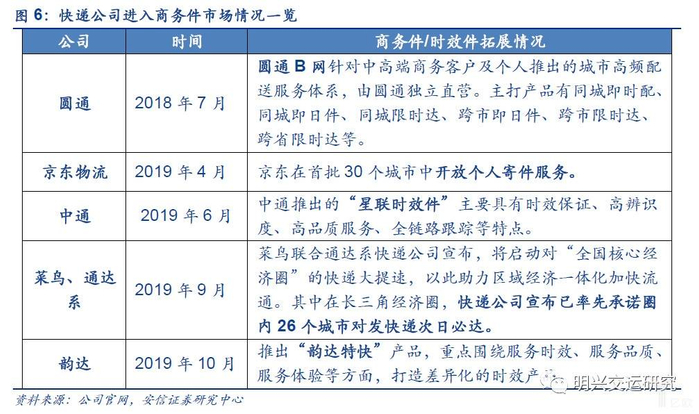 19年以来,随着京东开放个人寄件、中通推出中高端星联时效件、韵达推出“韵达特快”时效产品,京东以及通达头部企业已经开始布局商务件市场,对于未来市场格局的演进,我们认为顺丰在商务件市场的主导地位短期难以撼动,考虑到: