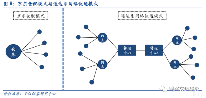 2)对于京东,其类似顺丰的直营重资产模式能够保证其服务质量,但其难点在于以仓配主的B2C模式能否匹配传统快递C2C的网状结构,以达到时效最佳。