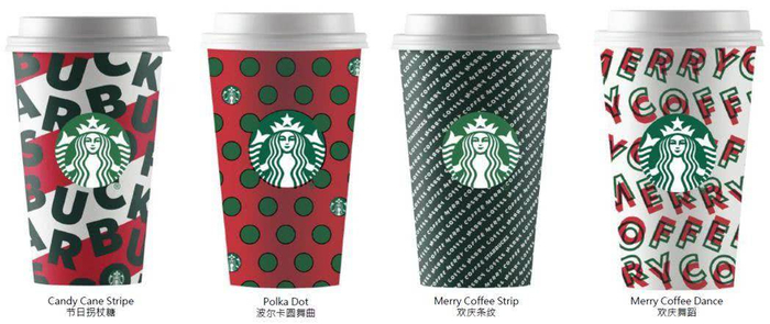 今年的圣诞杯有四种图案,在经典红、绿风格的基础上,融合复古前卫与动感新潮。