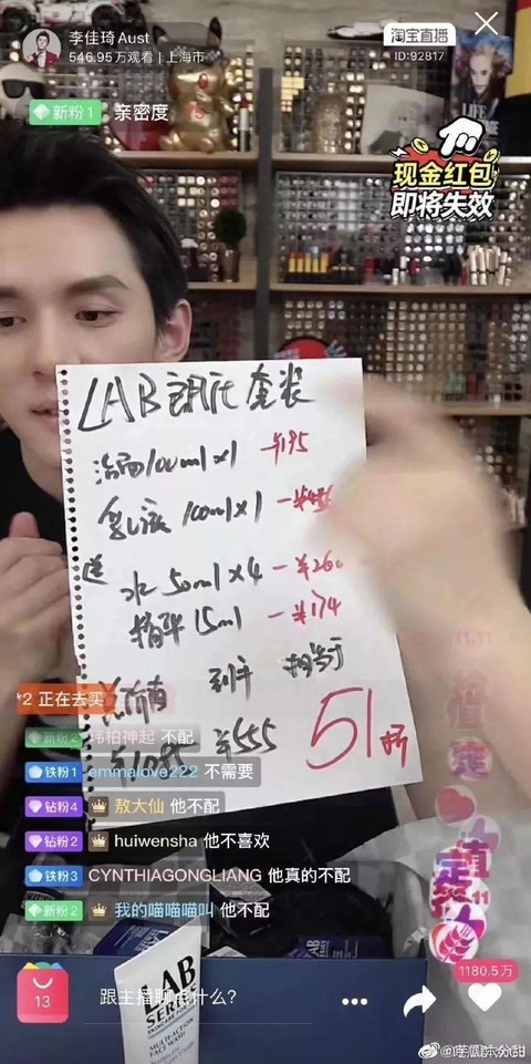 “一夜带货一套房”的薇娅也不甘示弱,首场直播预售中一共推了40多款产品,每款都附带着“买X送X”的优惠标签:“兰蔻洗面奶买一送一,玻尿酸买一送四,还能抽陈情令演唱会票……”
