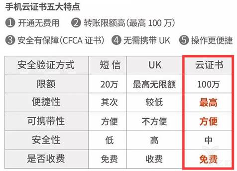 该行与中国金融认证中心(CFCA)联合推出全新数字证书技术,只需在手机银行APP安装“云证书”,无需借助UK(U盾)硬件,即可随时随地实现大额转账。
