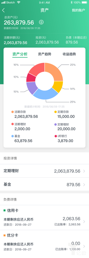 资产视图功能可以让用户更全面、直观地了解自己的资产负债情况,视图设有资产分析、资产趋势、收益趋势等模块,一目了然。线上资产管理能够帮助用户更加懂得自己,不只是看到自己有多少存款,也方便银行为客户提供更全面的服务,使“线上营业厅”概念更加清晰化。(如下图)