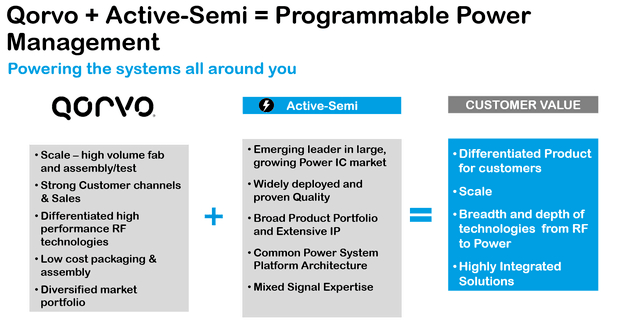 他进一步指出,在5G和物联网时代,这种无处不在将会成为一种常态,因此如果我们能够将Qorvo的RF产品与Active-Semi的电源产品更好地结合,借助Qorvo的销售渠道把整合两者优势的方案推向大客户,这无论是对Qorvo还是对客户来说,都是有利的。