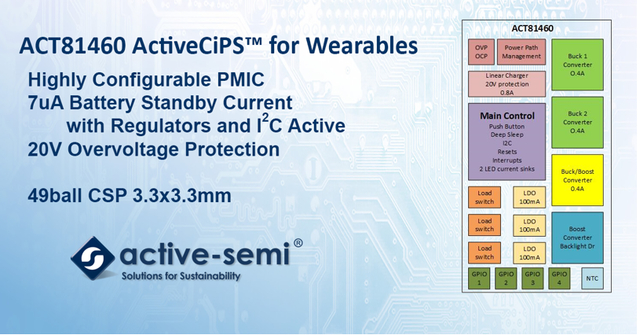 更重要的一点,Active-Semi在攻克这些市场的期间,还积累起了开辟更多新市场的技术基础。以近来迅速崛起的可穿戴设备市场为例,Active-Semi就推出了集合了其先进经验的首款可穿戴设备电源管理ICACT81460。