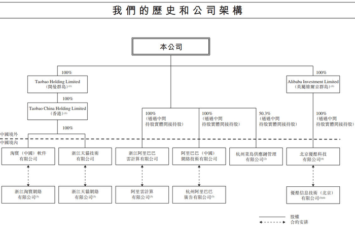 截至2019年6月30日,阿里巴巴通过约710家在中国设立的子公司和并表实体以及约530家在其他国家和地区设立的子公司和并表实体,开展业务经营。与很多在全世界、各行业均有业务的大型跨国公司类似,随着持续通过内生增长及收购整合新业务并实现拓展,通过大量中国境内及境外运营实体开展业务。