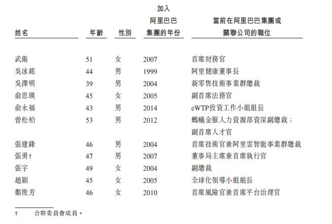 招股书披露了阿里巴巴现有的合伙人,共计38人,马云、蔡崇信、张勇等均在列,其中合伙委员会名单共计六人,包括马云、彭蕾、井贤栋、蔡崇信、王坚、张勇。