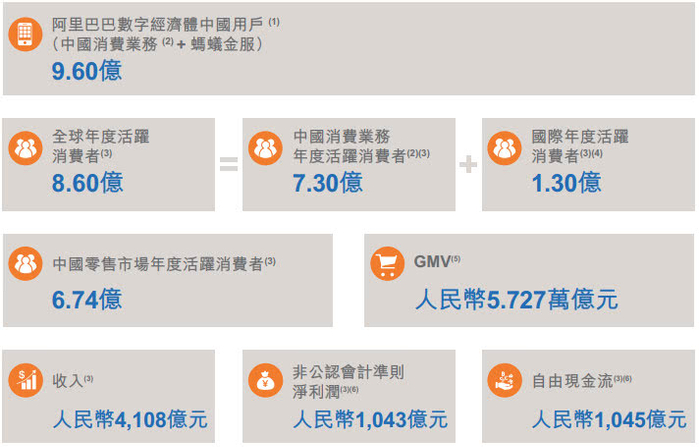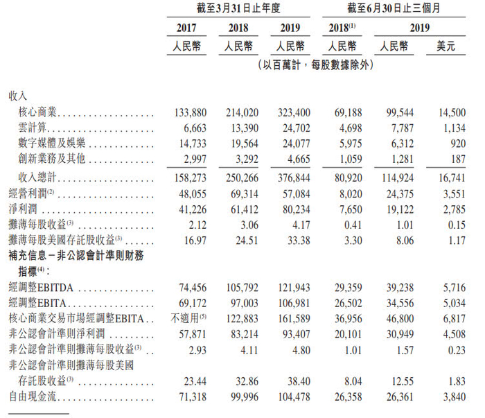 (4) 有关非公认会计准则财务指标的定义及其与最接近的可比美国公认会计准则指标之间的调节,请参见「财务资料-非公认会计准则财务指标」。核心商业交易市场经调整EBITA指在核心商业经调整EBITA中剔除以下各项业务的影响:(i)本地生活服务;(ii) Lazada;(iii)新零售和进口直营;及(iv)菜鸟网络。