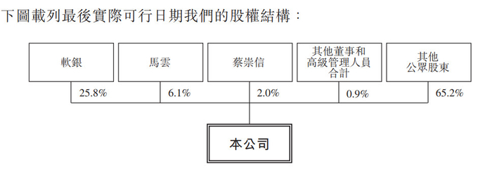 马云约持股12.777亿股,IPO前占股6.1%;蔡崇信持股约4.112亿股,占股2.0%。全体董事和高管合计持股9.0%。