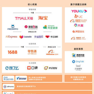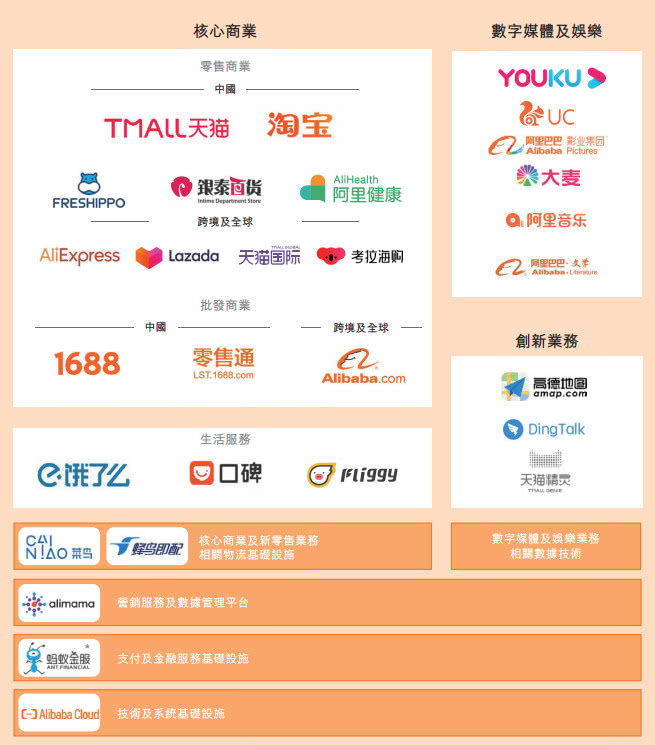 我们的业务包括核心商业、云计算、数字媒体及娱乐以及创新业务。除此之外,我们的非并表关联方蚂蚁金服为我们平台上的消费者和商家提供支付和金融服务。围绕着我们的平台与业务,一个涵盖了消费者、商家、品牌、零售商、第三方服务提供商、战略合作伙伴及其他企业的数字经济体已经建立。