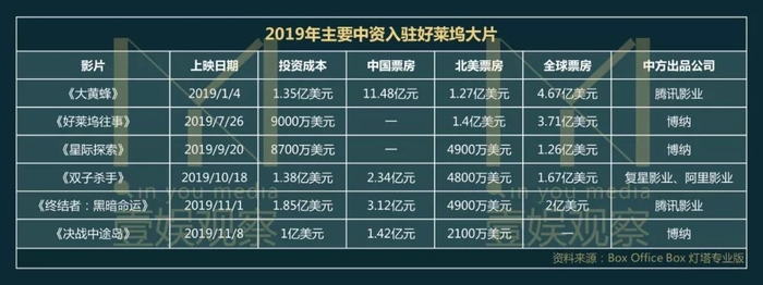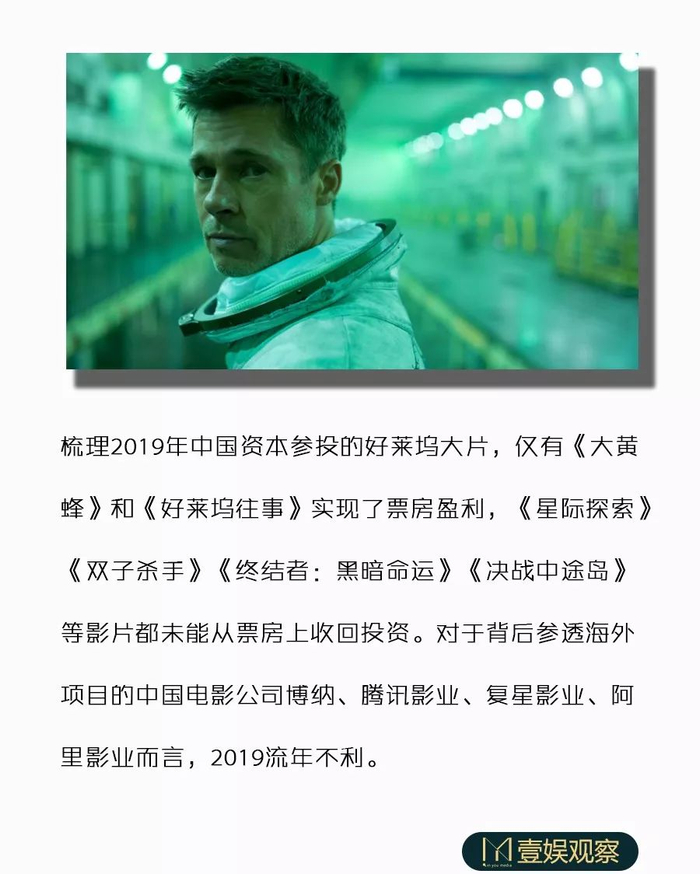 不仅博纳影业,2019年腾讯影业、复星影业、阿里影业对好莱坞大片的投资都显得不太顺,中国资本的好莱坞之旅流年不利。