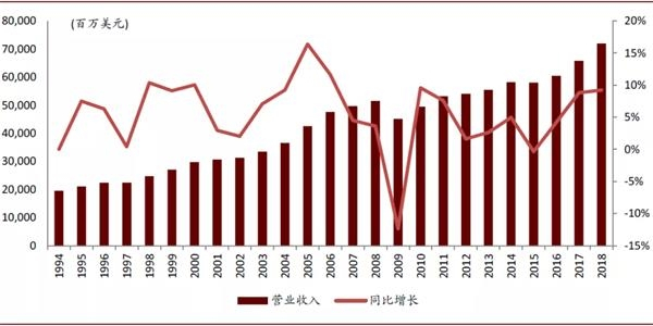 图表: UPS营业收入及其增速:过去20年复合增速5%