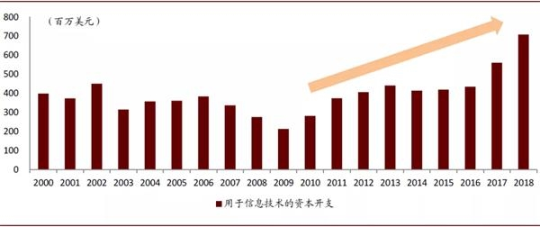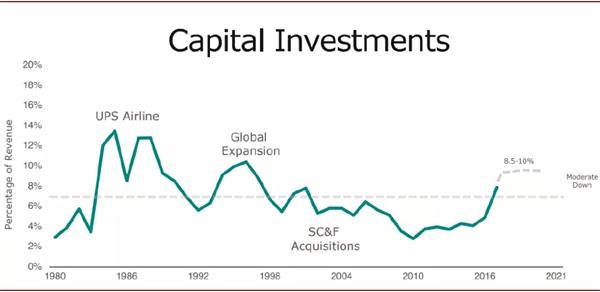 快递行业具有明显的规模效应,主要是建立在资本开支的前提下,这也是为什么快递行业容易诞生大公司的原因。UPS过去多年的投资已经建立了护城河,例如UPS经历了购建航空机队、全球扩张和与供应链服务相关的并购三个主要的资本开支高峰阶段(资本开支占收入的比例可达10%-15%),目前则处于一个新的科技投入阶段(过去五年每年约5亿美金科技投入)。相比而言中国快递公司科技投入仍不足。