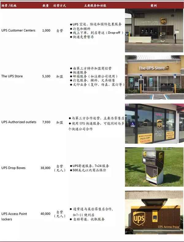 UPS自营的客户中心数量较少,约为1,000个,可以提供全系列的所有产品,UPS还通过无人运营的Drop