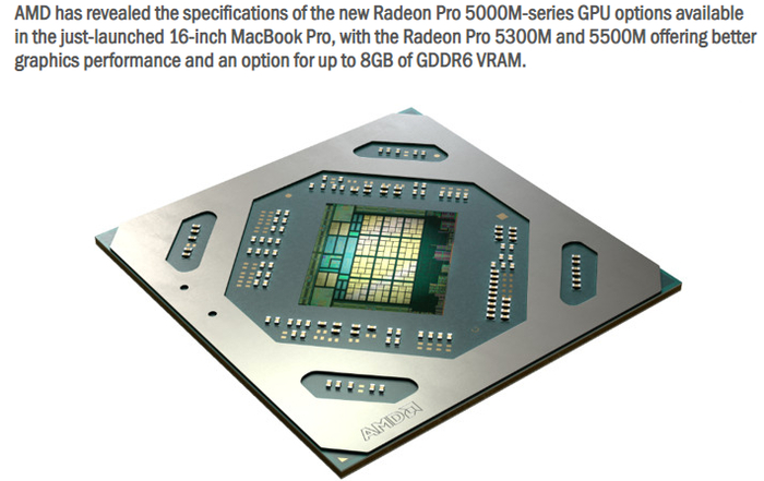 11月13日,AMD又宣布苹果最新Mac Book Pro搭载了全新的AMD Radeon Pro 5500M和5300M移动显卡。AMD Radeon Pro 5000M系列移动显卡是首款为专业用户打造的7nm独立显卡,凭借行业领先的制程技术和强大的AMD RDNA架构为视频编辑、3D内容创建和基于mac OS的游戏开发提供了突破性的图形性能。