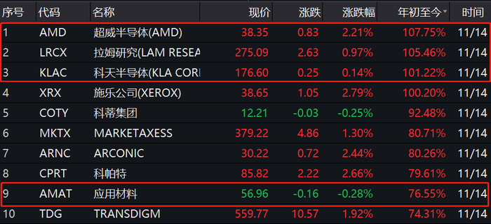 截至目前,AMD是标普500今年以来表现最佳的成分股,在标普500涨幅TOP10中,还有三家公司一样来自半导体行业分别是第2、3名的分别是半导体蚀刻机台制造商拉姆研究、晶圆检测设备制造商科磊涨幅分别有100.09%、97.06%,第9名的应用材料。