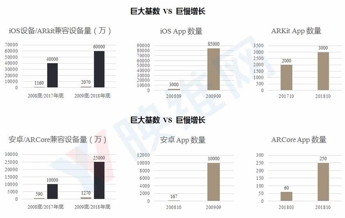 如果单纯地从消费市场去对比评估,也许可以说ARKit/ARCore是彻底失败的技术。2017年底,市场上有4亿台可兼容ARKit的iOS设备,到2018年底这个数字是6亿台,但是App Store上支持ARKit的App数量只从2000多款增加到3000多款。类似的发展情况也出现在ARCore上,2017年底市场上有1亿台可兼容ARCore的安卓设备,到2018年底达2.5亿台,但是Google Store上支持ARCore的App数量不到300款(2018年底)。虽然这是一年前的数据,但过去一年并没啥变化。