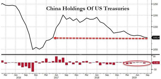 正如下图数据所示,中国所持美债也已连续二个月大幅下降,这也是在过去的七个月中第六次抛售美国国债,目前持仓降至自2017年5月以来的最低水平至1.102万亿美元,而从更长时间范围来看,截止今年9月的前12个月,中国已累计抛售了约911亿,2016年2月的峰值为1.25万亿。