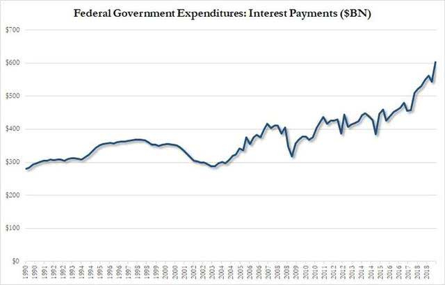 据美国财政部公布的报告显示,在2019财年,美国联邦政府在利息支付上花费了近6000亿美元,我们注意到,这已经超过用于教育,农业,交通和住房的总费用的金额。