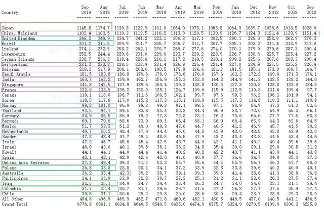另外,数据还显示(下图),在十大美债海外持有地区之中,9月只有爱尔兰、卢森堡和开曼群岛分别增持了16亿美元、80亿美元和24亿美元的美债,其余美债持有者均出现不同程度的减持,比如,印度减持了15亿,法国减持了19亿,澳大利亚减持了22亿,沙特和德国也分别减持了20亿美元左右。