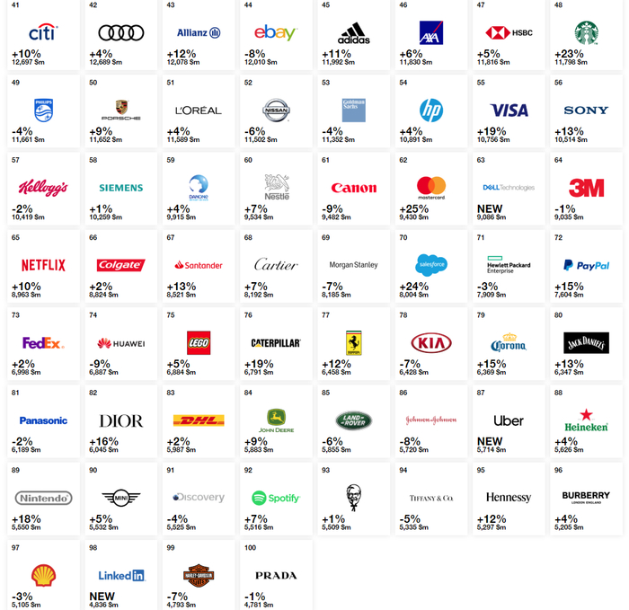 今年,Facebook已经跌出前10名,现在位列14,在2016年,它是所有公司中增长最快的品牌,并在2017年达到第八名。华为是中国唯一上榜企业,品牌价值在过去一年中下降了9%,至69亿美元位列74名。