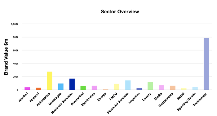 从行业看,科技品牌有点「一枝独秀」的意思,技术行业的整体品牌价值为7900亿美元,约为第二大类别汽车(价值2790亿美元)的三倍。