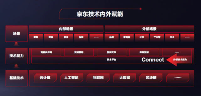 京东技术的对外开放赋能基于自身形成的核心技术。在基础技术层,京东依托云计算、人工智能、物联网、大数据、区块链等技术,并进一步发展优化技术平台、智能供应链、智能营销、智能交互、数据智能等技术能力,在服务内部场景的同时,对品牌商、零售商、社区、产业带、基金等外部场景进行技术赋能。