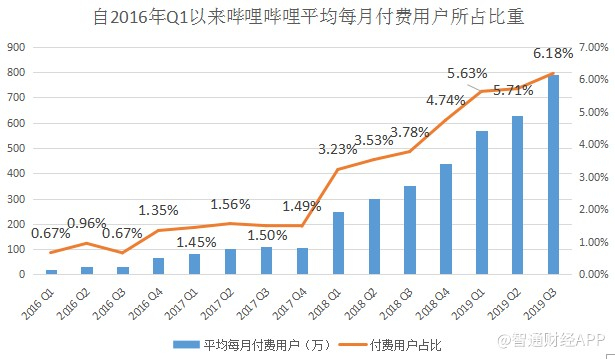 数据显示,从2016年第一季度以来,平均每月付费用户所占比重不断提升,至2019年第三季度时,该比例已上升至6.18%。付费用户占比的持续提升,说明了哔哩哔哩多元化变现渠道的有效性。