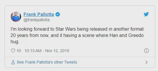 CNN 记者 Frank Pallota 吐槽:我期待20年后星战再次重新发布新版本,在里面韩和格里多能够相互拥抱。