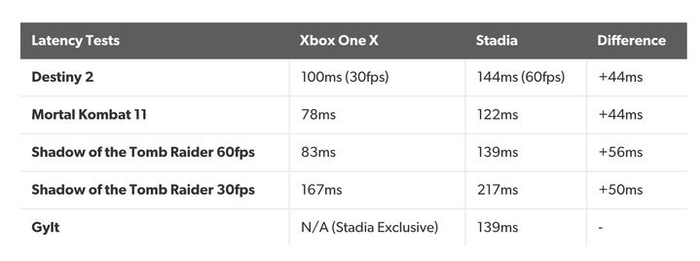 Eurogamer 则用高速摄录机对比了 Xbox One X 和 Stadia 的延迟数据,两者差距大概在 40-50ms 左右。