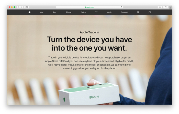 但也许苹果官方以旧换新交易最大的缺点就是我们不能把你交易的任何价值都用在苹果产品上。如果你在Apple.com或Apple Store应用上使用下单进行设备交易,这些回收的钱会被转换成苹果的礼品卡,而如果你不打算继续购买苹果的商品,这些礼品卡如何处理就是个问题。这可能是你关心的问题,但也可能不是。