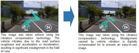 振动补偿技术结合了松下公司专有的图像稳定技术,后者已经用于数码相机等产品。该技术能够减少因车辆振动而引起的实际空间与显示图像之间的偏差。