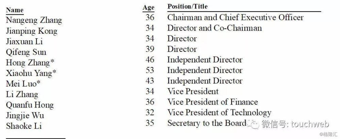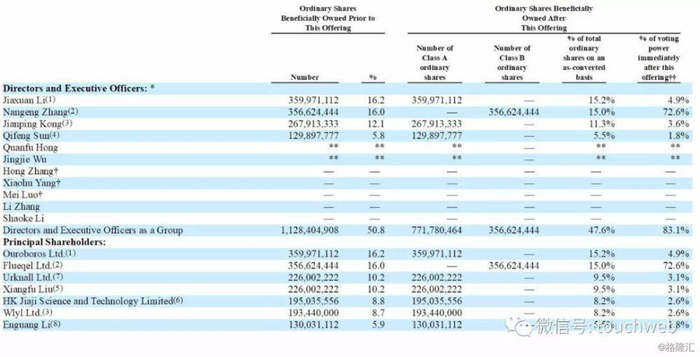 IPO后,Jiaxuan Li持股15.2%,有4.9%投票权;张楠赓持股15%,有72.6%的投票权;Jianping Kong持股11.3%,有3.6%投票权;Qifeng Sun持股5.5%,有1.8%的投票权。