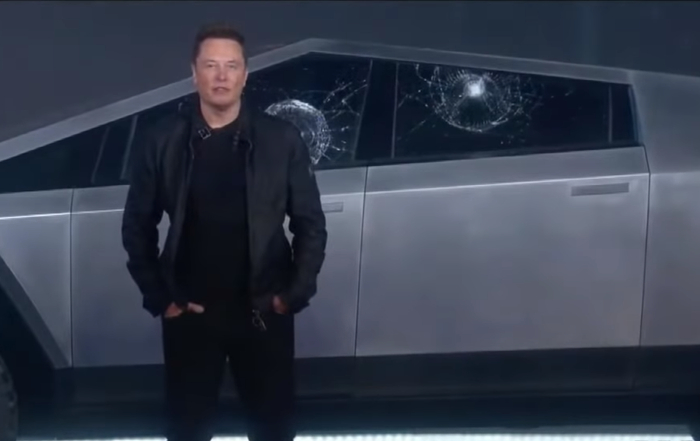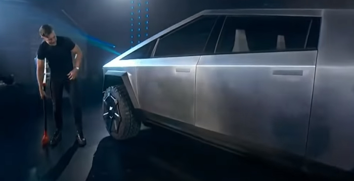 为了提升稳固性,Cybertruck的车身采用了马斯克另一家公司SpaceX的同款技术,和StarShip火箭一样被30倍冷轧不锈钢板覆盖。说到这里,马斯克微微一笑叫来同事,用“80一次”的大锤向车身狠狠砸去,但没有留下什么直播中能看出的痕迹。