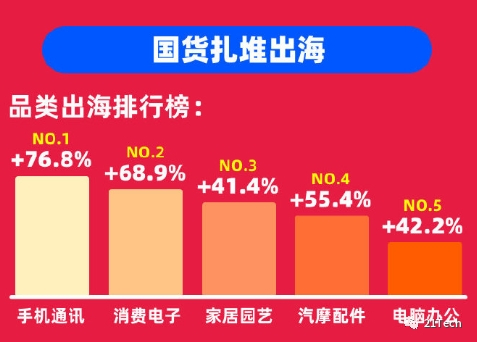 与此同时,出海品类前5名分别为手机通讯、消费电子、家居园艺、汽摩配件及电脑办公。其中,手机通讯成交金额同比增幅高达76.8%。俄罗斯作为速卖通全球最重要的市场之一,双11销售额达到了2.67亿美元,创下历史新高。