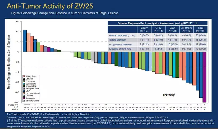 根据Zymeworks公司公布的最新数据,此项ZW25的1期临床入组病人69例,入组病例包括胆管癌、直肠癌和胃癌等10多种实体瘤。其中,80%的病人至少接受一种HER2的靶向治疗方式,接受前期治疗的中位值达到3。在接受ZW25的每周10mg/kg或每两周20mg/kg初始剂量情况下,在最终可评估的57个病例中有25个得到部分响应,客观响应率达43.9%,其中15个病例疾病稳定至6个月以上,这意味着疾病控制率达到了70.2%。