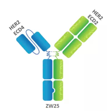 作为一款双特异性抗体,ZW25可以同时结合两个非重叠的HER2表位,即双互补位结合。这种独特的设计可形成多种作用机制,包括双重阻断HER2信号、增强结合并去除细胞表面的HER2蛋白、强有力的抗体效应子功能以增进在患者中的抗肿瘤活性。