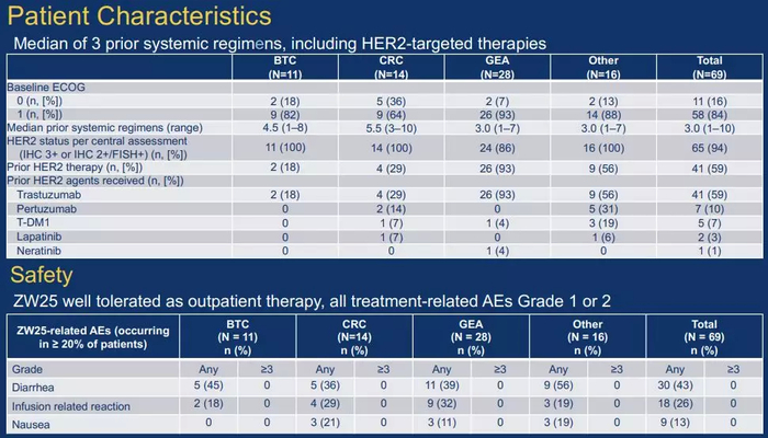 在各种癌种之中,其在胆管癌中的客观响应率最高,达到了66.7%,疾病控制率达到78.8%。直肠癌和胃癌中的客观响应率分别为46%和39%。此外,在其他类型的肿瘤中也可以看到确认的反应,包括胰腺癌患者的靶病变减少100%。中位无进展生存期为5.5个月,且仍在持续评估中。此外,ZW25最常见的治疗相关不良事件均为1级或2级,未发现严重不良反应,耐受性良好。