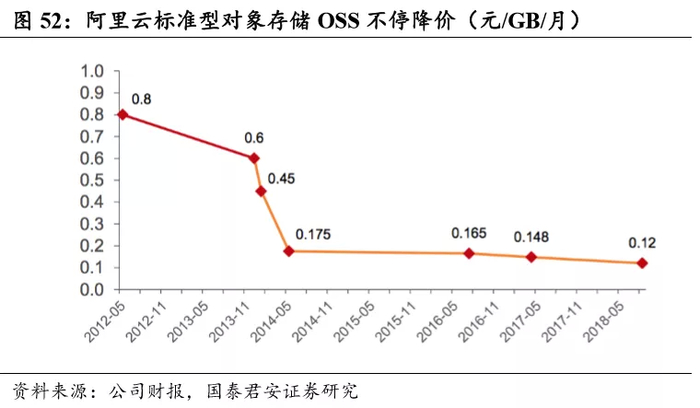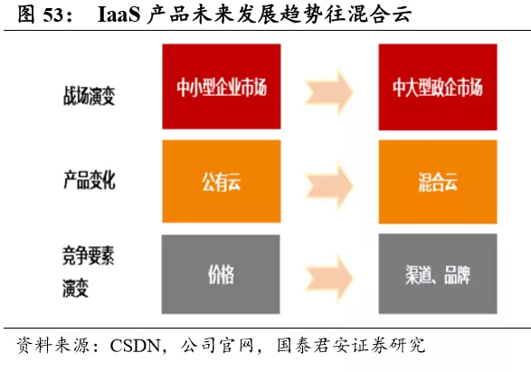 中小企业对价格较为敏感,因此,早期的价格下降将有效提升市场份额。但经过数轮调整后,云计算产品价格已经较低,降价空间逐渐缩小,降 价幅度趋于平缓。从技术层面来说,随着云计算技术在弹性、异构管理、 可靠性可用性等功能、指标上越来越同质化,预计未来 IaaS 层技术差异 化空间越来越小。因此,我们认为未来我国公有云战场将转至中大型企 业市场。