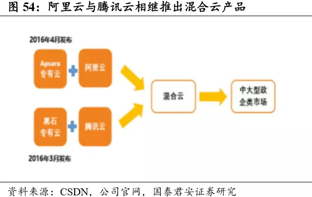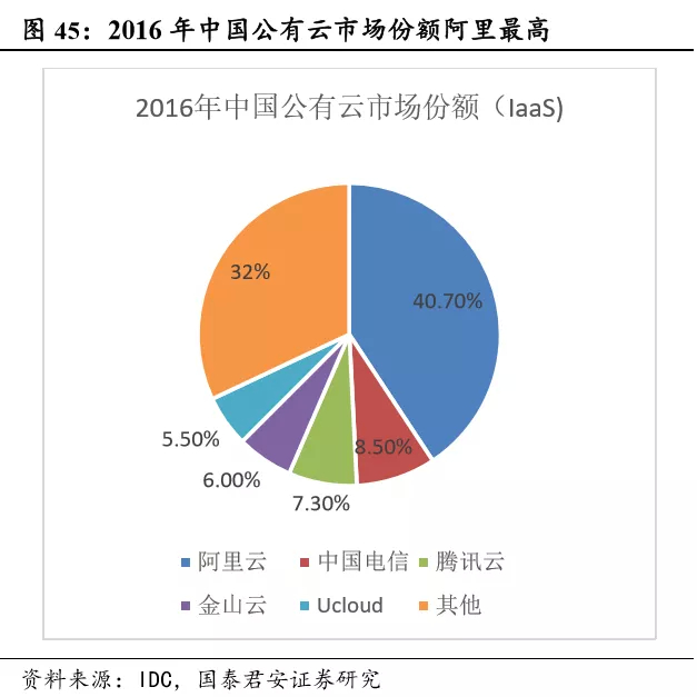 预计阿里云将保持领先地位,腾讯云有望借中大型企业市场缩小与阿里云差距。阿里云凭借其渠道、品牌和技术方面的综合实力,有望继续保持领先地位。腾讯云在渠道、产品上快速跟进,有望缩小与阿里云之间的差距。另外,电信供应商技术层面乏力,外资云计算厂商受政府政策限制约束,我们并不看好这两类型公有云厂商在中国市场的未来发展。