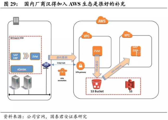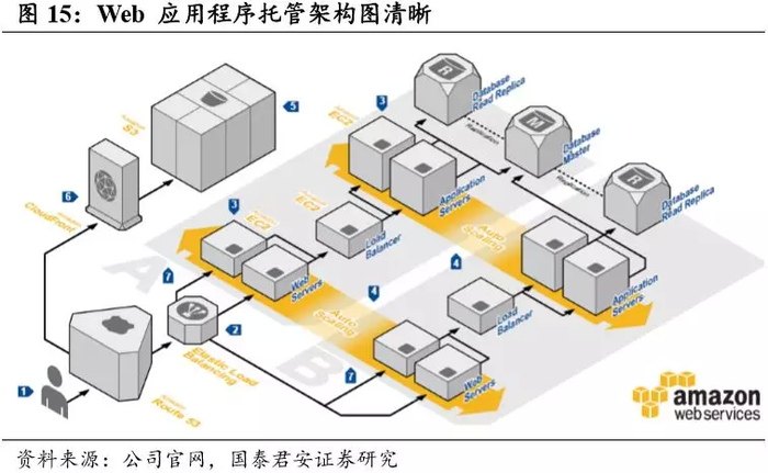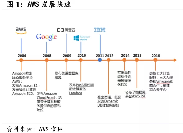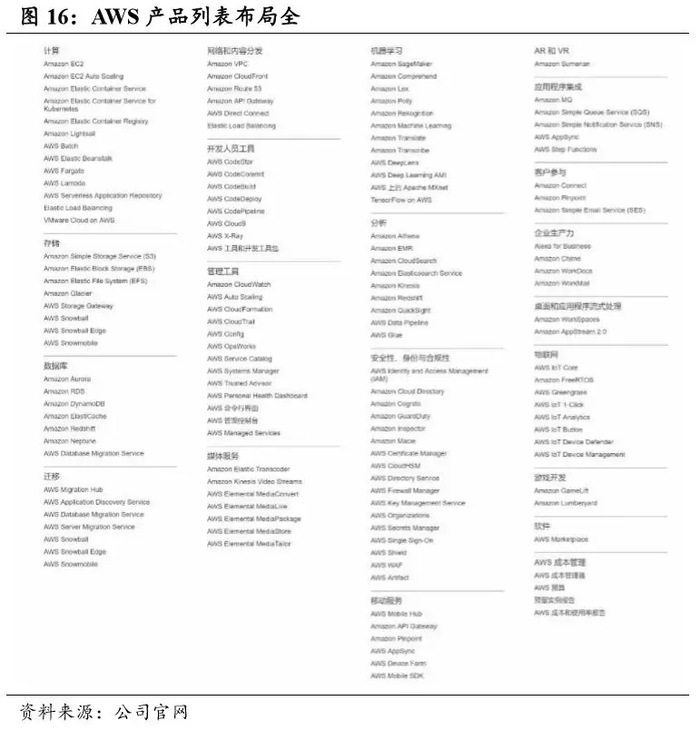 AWS 提供了一个可扩展的、高度可靠的平台,使客户能够快速安全地部署应用程序和保存数据。从 AWS 的架构来看,公司云服务由七部分组成,这些服务功能分别归属于计算、存储与内容分发、数据库、联网、 管理和安全、分析、应用程序服务、部署与管理以及移动服务。各项服 务均有模块化提供,最基础重要的模块服务为:计算模块(EC2)、存储 模块(S3)和数据库模块(RDS),客户可以通过 PaaS 平台定制自己 的解决方案。AWS 的弹性计算以 EC2 为核心发展了计算服务矩阵,并将各块服务无缝连接,在产品类型和规格扩展上拥有最为全面的部署;在存储和数据库产品方面,AWS 已覆盖了六种常见的 SQL 数据库,能够提供一整套云存储服务,满足企业对云 IT 环境的设计要求;此外,AWS 还将应用程序进行拓展延伸,提供移动服务和媒体服务、机器学习、企业生产力等多方面的技术支持,帮助开发人员更快部署云计算能力。