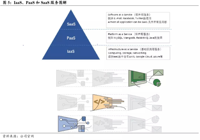 云计算网络供应商通过网络云服务平台,向其客户提供所需的 IT 资源,主要包括云计算能力,存储,数据库支持等。云计算提供的服务可以分为三层:基础设施即服务、平台即服务和软件即服务。