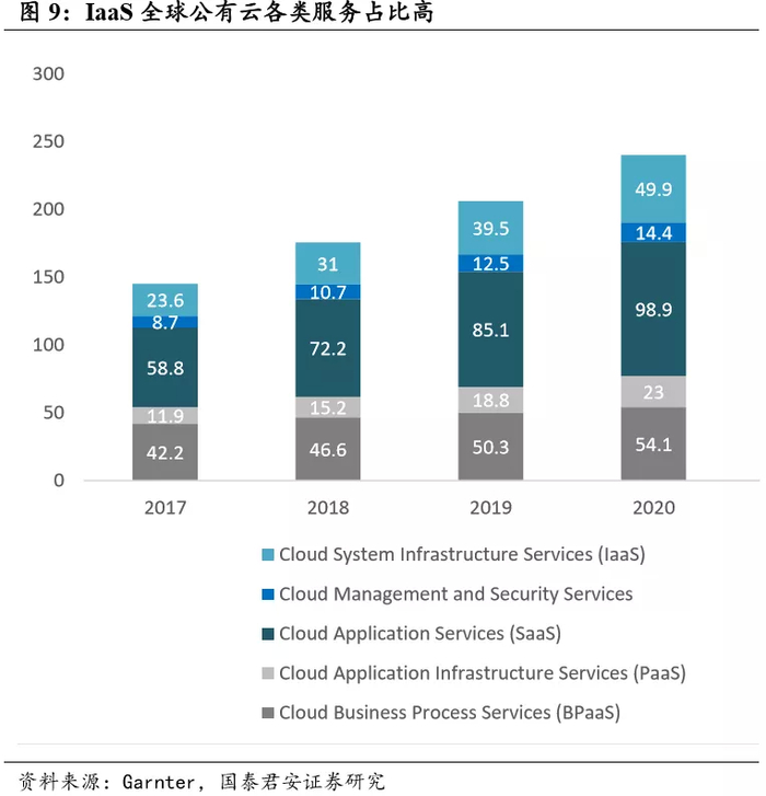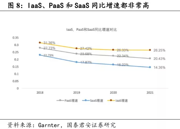 AWS在目前巨大体量下,仍保持每季度收入年化后(annual run-rate)20亿美元的增幅。目前IaaS占有率50%以上,而目前全球工作负载的上云率仅为15%,长期来看上云率会达到50%以上。而SaaS市场空间上将不小于IaaS+PaaS,未来整体公有云市场空间广阔,全球公有云市场至少在5000亿美元以上。