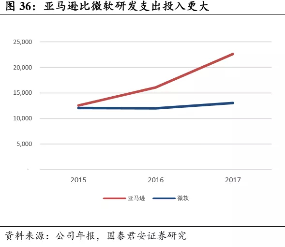 沉默的巨头,研发支出遥遥领先。媒体公布的数据显示,2017年亚马逊研发支出再创新高,为 AWS、Alexa 等技术投入大量的资源支持。自 2006 年 AWS 上线以来,公司持续性注重产品的研发与性能的提升。年 报显示,研发费用维持高位且不断增长,从 2006 年的 662 百万美元到 2017 年的 22,620 百万美元,远超市占率排名第二的微软。除此之外, 研发费用占总运营成本亦持续性上升,说明公司对产品的研发保持高度重视。