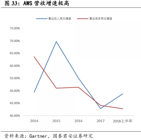 AWS 营业成本增速呈现下降趋势,且已经持续低于营收增速,产品价格 不断下降,AWS 规模效应正逐步凸显。2018 年上半年,营业收入同比 增速为 48.78%,高于营业成本同比增速 42.8%。