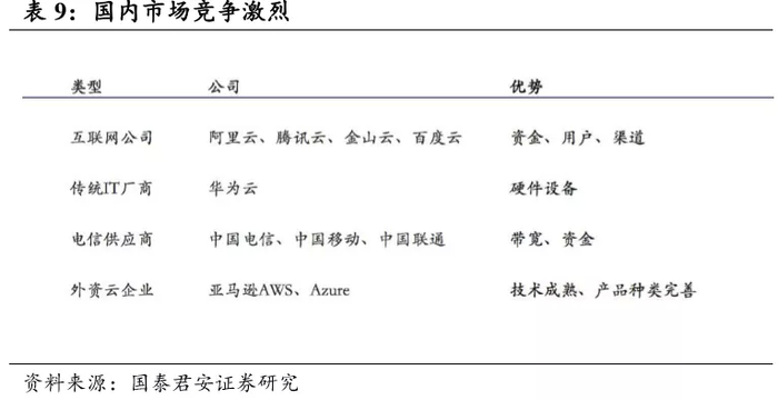过去我国公有云 IaaS 层供应商的竞争主要集中在中小企业客户的抢夺。从阿里云客户ARPU 值来看,阿里云季度营收实现近 4 倍增长,而 ARPU 值仅从 2253.5 元上升到 2579.3 元,变化较小,说明驱动阿里云成长的 是中小客户数量的增长。